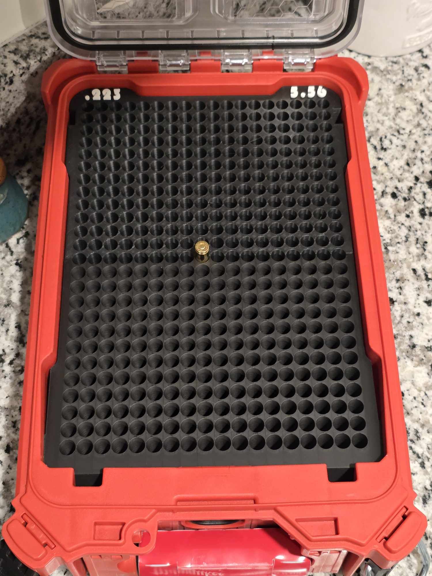 Transform your Milwaukee Packout into the ultimate ammo box. 3D printed, securely holds 450 .223 or 5.56 calibers!